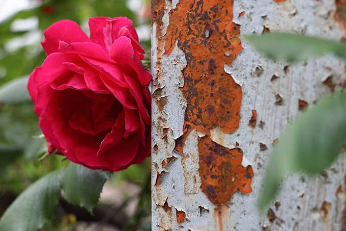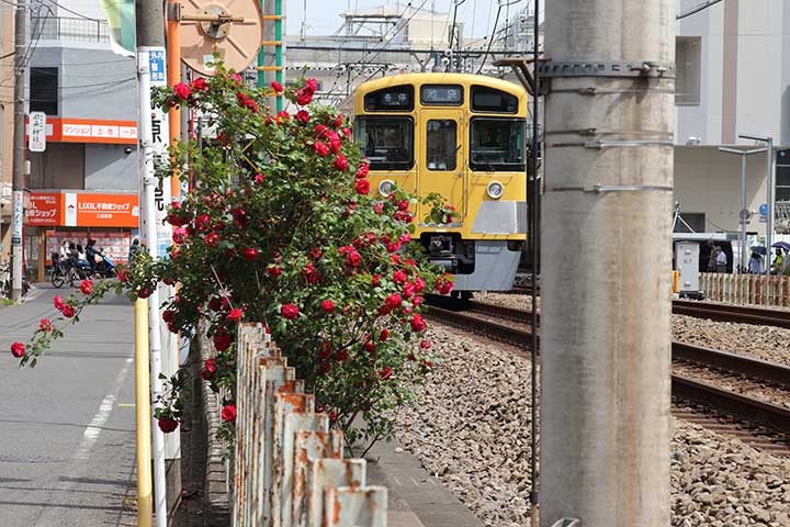 手前に真っ赤なバラ。動く電車を背景にして連写する。100メートルほど先の駅構内を望む構図も押さえた。電車とバラの組み合わせはありきたりすぎるかと思いつつ鉄柵の支柱に近づくと、塗装が剥げ落ち、焦げ茶の鉄錆が浮き出ている。これこれ。傷んだ花びらの先っぽも外してはいけない。花が萎れても、似つかわしい居場所を記録したい-。妄想を掻きたてながら、線路北側の道路を小1時間ほど徘徊した。