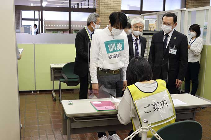 特に安全・安心の接種体制を組むため、集団接種の手順や課題を洗い出すリハーサルが4月21日、田無庁舎会場で実施された。検温やクーポン券などを確認する「事前受け付け」から、問診票の記入漏れなどをチェックする「接種受け付け」、医師の「問診」、看護師による「接種」、「健康観察」など、一連の流れを確かめた。容体急変のケースも想定し、訓練した。