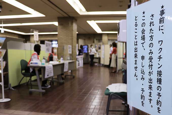 西東京市役所の田無庁舎で5月11日、85歳以上を対象にした新型コロナワクチン接種が始まった。市内の集団接種3会場のうち、エコプラザ西東京1階多目的スペースは5月14日から、(仮称)第10中学校(新ひばりが丘中学校体育館)は5月13日からのスタートとなる。(写真は、ワクチン接種が始まった田無庁舎)