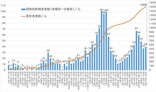 西東京市は5月26日、新型コロナウイルスの週間感染は40人になったと発表した。前週比3人増だった。累計感染は1506人。既に退院したり死亡したりするなどは1439人、現在療養中は67人となった。