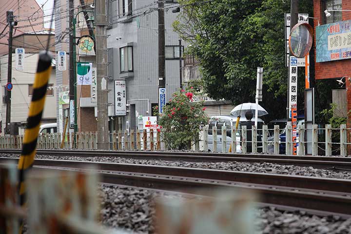 雨が降りしきる5月27日午前、カメラを抱えて西武池袋線ひばりヶ丘駅に向かった。駅西側、東久留米駅寄り約100メートルほどの線路脇に深紅のバラが咲いている。雨に打たれて花々も痛みが目立ち、行き交う電車の風圧に枝ごと揺れていた。
