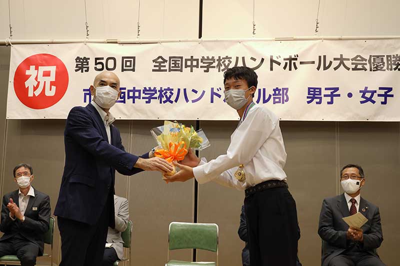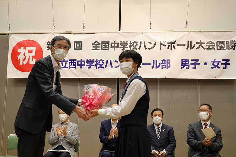 この日は男女ハンドボール部員を始め、薮野校長、ハンドボール部顧問の知名英則、灘千賀子の両教諭やコーチら約40人が参加。並木市長らが男女の代表に花束を贈って生徒の活躍を讃えた。