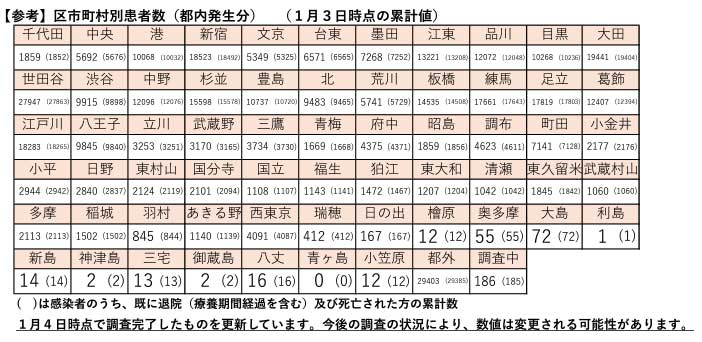 東京都の発表によると、1月3日時点の患者数(都内発生分)は世田谷区がトップで27947人に上る。多摩地域ではトップの八王子市が9845人。近隣では練馬区17661人、三鷹市3734人、武蔵野市3170人、小平市2944人、小金井市2177人、東久留米市1845人、清瀬市1042人などとなっている。