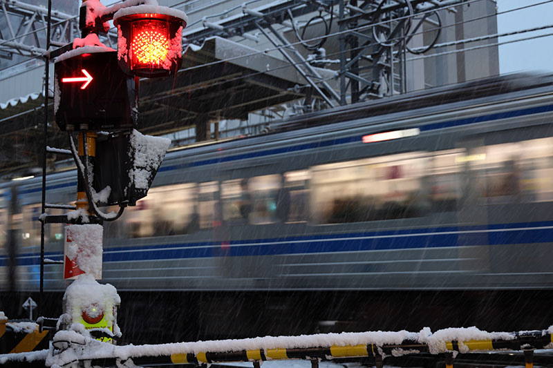 駅に近づくと、踏切の警報が鳴り、点滅する赤いランプが目に飛び込んでくる。やがて電車が1本、2本、3本…。上下線の普通、準急、急行、特急が次々にやって来ては目の前を通り過ぎる。10分ほど待って、やっと上がった遮断機から、積もった雪がバラリと落ちてきた。