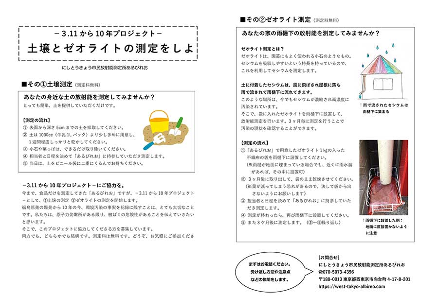 にしとうきょう市民放射能測定所あるびれおは、2012年7月1日に西東京市向台町の一画で開所しました。この10年間の取り組みを紹介し、現在実施している<3.11から10年プロジェクト>への市民の協力を募っています。