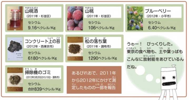 食品では2011年夏に杉並区で穫れた山桃の酒からセシウム137と134を合わせて9.16ベクレル/Kg、山桃の実から106ベクレル/Kg、2012年小平市にある農園のブルーベリーから6.40ベクレル/Kgの値が出ました(注2)。