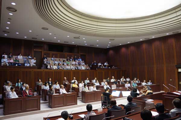 西東京市議会の2015年第3回定例会開会中の8月31日(月)午前、一般質問に先立って「議場コンサート」が開かれた。東京ニューシティー管弦楽団の女性奏者4人が、モーツァルトやハイドン、チャイコフスキー、ドボルザークの曲を演奏。詰めかけた市民ら84人が本会議場の傍聴席や議員席を埋め、稲垣裕二議長ら市会議員のほか、丸山浩一市長や市幹部職員らと一緒に弦楽四重奏に耳を傾けた。(写真:西東京市議会事務局提供)