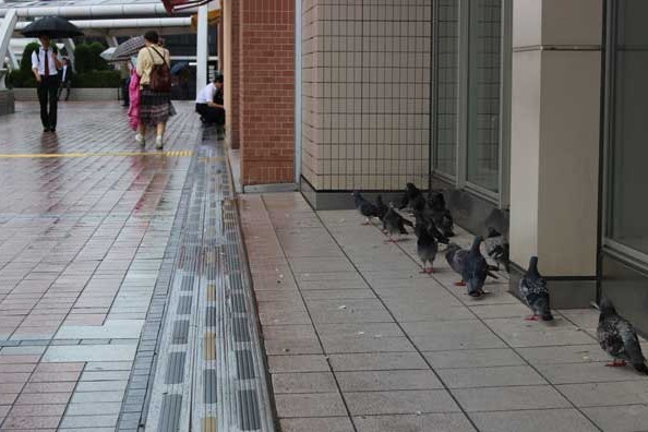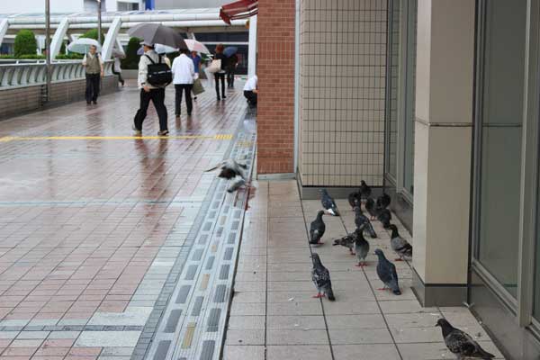 [2015年]9月2日(水)午前10時前。西武新宿線田無駅のペデストリアンデッキ(連絡通路)に出たら、10数羽の鳩が、駅ビルのひさしを借りて雨宿りしていた。長雨と低温の毎日。無聊をかこつ風情に見えなくもない。