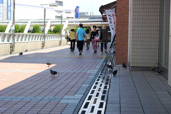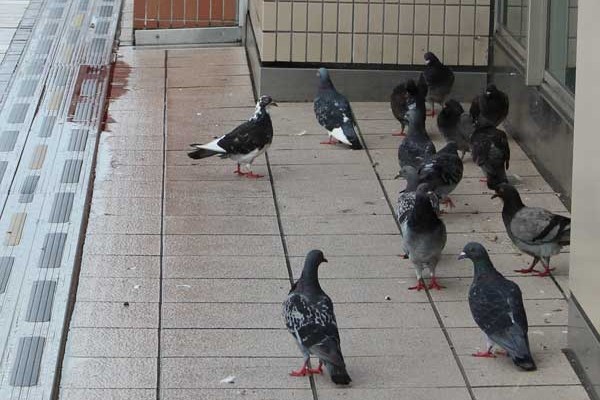 雨宿りから日向ぼっこ? ペデストリアンデッキにハトの群れ