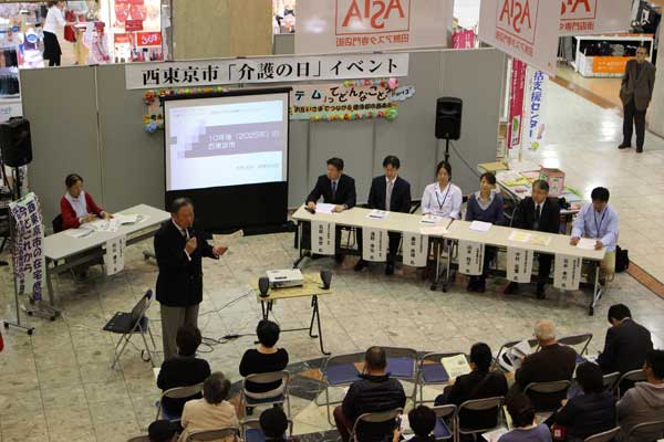 11月11日は「介護の日」。西東京市はこの日、田無駅北口のアスタセンターコートで、「在宅療養の今とこれから」のテーマでトークショーを開催した。丸山浩一市長がまず挨拶し、10年後に西東京市でも高齢化が進む状況をスライドで説明して出席者にバトンタッチした。(写真は、挨拶する丸山浩一市長=アスタセンターコート)