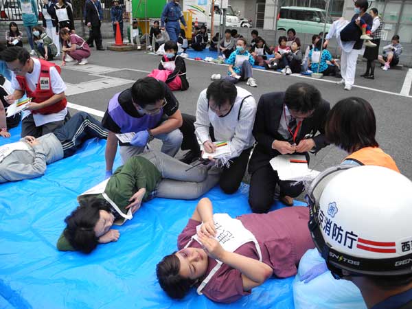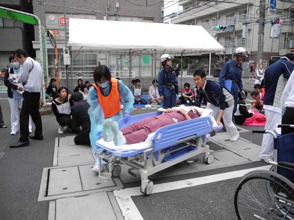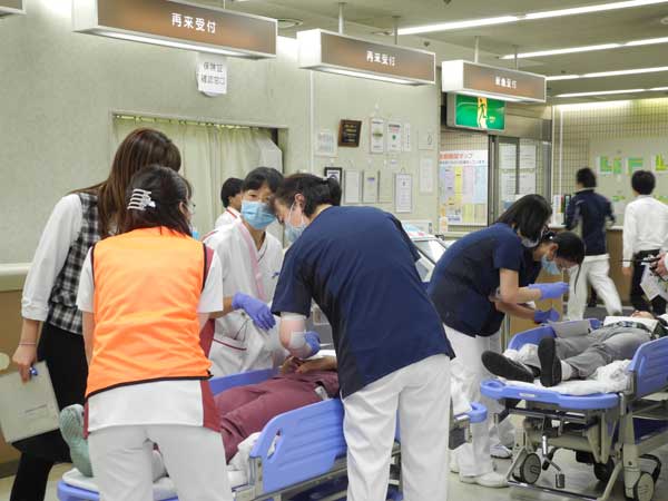 その後、負傷者に扮した病院職員に対し、医師らがけがの状況などを見極め、治療の優先順位を決めるトリアージを実施。実際の救急患者と同様の模擬応急処置が行われた。両病院間の搬送受け入れ訓練では、互いの専門分野を共有し、西東京中央総合病院から佐々総合病院へは妊婦患者が、佐々総合病院からは透析患者が搬送された。