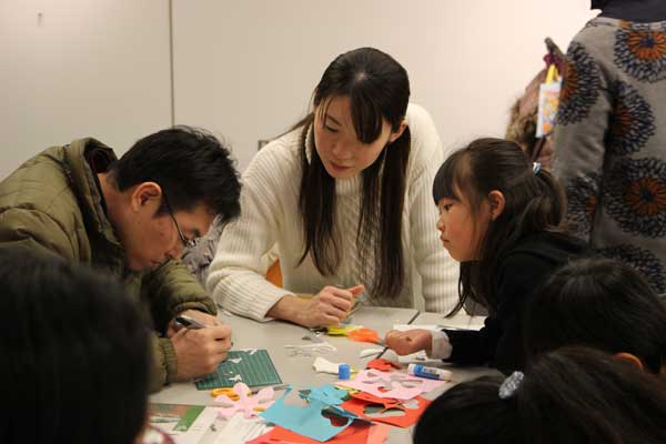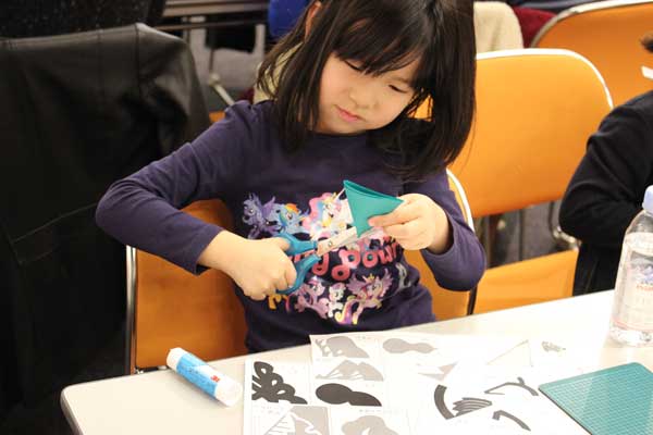 市内在住の菊地学さんは家族4人で参加した。「妻に誘われてきました。工作は好きなんです」と言いながら、家族が見守る中、カッターで複雑な型を熱心に切り抜いていた。