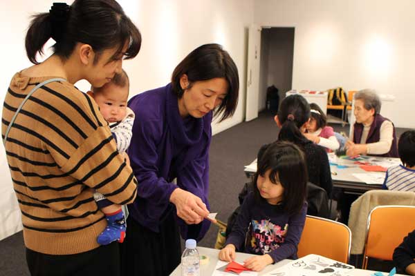 「小学1年の娘が学校でもらったチラシを見てこの催しを知りました」という古川優子さん。「娘が参加したいというので一緒に来ました」。生後6カ月の赤ちゃんとともに、娘の絢菜(あやな)ちゃんの作業を見守っている。出来上がったはがきを手に、絢菜ちゃんは壁に張り出そうと駆け出していた。「娘は物おじしない性格なので人前にも積極的に出ていきます。楽しそうでよかった」