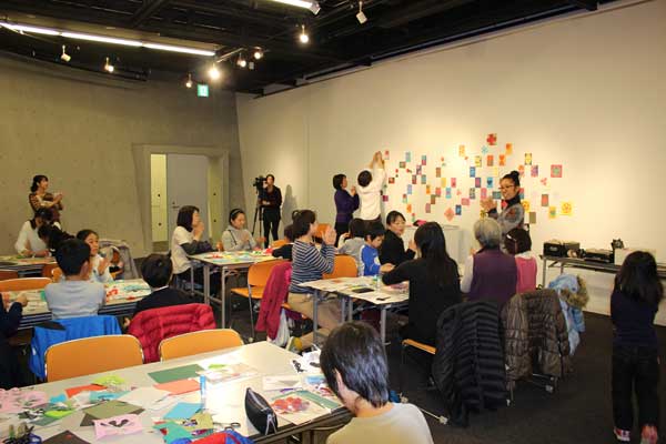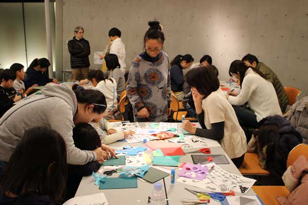 小金井市民交流センターの地下ギャラリーで、講師の造形作家下中菜穂さんがこんな言葉でワークショップを始めた。控えめな手が、ぱらぱら上がる。子供たちやお父さん、お母さん、それにおばあちゃんらが5卓のテーブルを囲んでいる。卓上には色紙や糊、ハサミやカッターなどが置いてある。