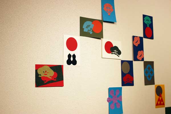 色とりどりのはがきが壁に張り出される。このあとのトークセッションに参加予定の能楽師、津村禮次郎さんが飛び入り参加して、能の衣装や小道具にも紋があり、独特の意味があると説明してくれた。