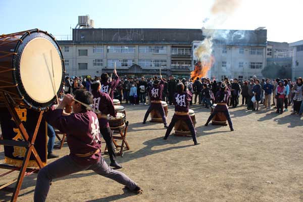 午後1時30分、西東京市を拠点に活動する「保谷和太鼓の会」による「鷹狩出陣太鼓」の演奏と共にやぐらに点火。火は勢いよく舞い上がり会場から歓声が上がった。