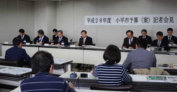 小平市は[2016年]2月5日、2016年度の当初予算案を発表した。一般会計予算案の総額は、過去最大規模の620億4000万円で、15年度に比べ3.2%増。一般会計に国民健康保険や介護保険など4つの特別会計を合わた総額は1031億300万円、同3.0%増となった。(写真は、小平市の記者会見)