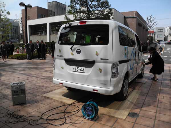 同社は大気汚染防止などを目的とした電気自動車を普及する「EVをもっと身近に!プロジェクト」「電気自動車活用事例創発事業」を全国展開している。より良い電気自動車の活用方法を提案した自治体をモニターとして選び、無償で貸し出す。西東京市は、市内の騒音、振動、大気汚染などの環境測定で予備電源として用いることを提案し採用された。