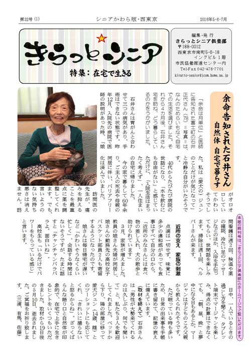西東京市の地域情報紙「きらっと☆シニア」(A4判、4ページ)は[2016年]5月17日発行の第32号で、当事者たちに取材した「在宅で生きる」を特集した。1面では、胃がんの闘病生活を続けた西東京市在住の女性(78)の在宅療養状況を本人の写真入りで掲載している。その女性は取材から19日後の5月10日に亡くなったという。編集メンバーの一人が主宰する「西東京 まちかどニュース」が特集の概要を紹介している。