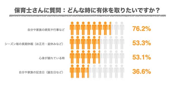 「どんなときに有給休暇を取りたいか」と尋ねたところ((複数回答可)「自分や家族の病気や行事」が76.2%で最も多く、「(正月やお盆休みなど)シーズンごとの長期休暇」53.3%などとなっていた。(図表はいずれも「保育士バンク」提供)