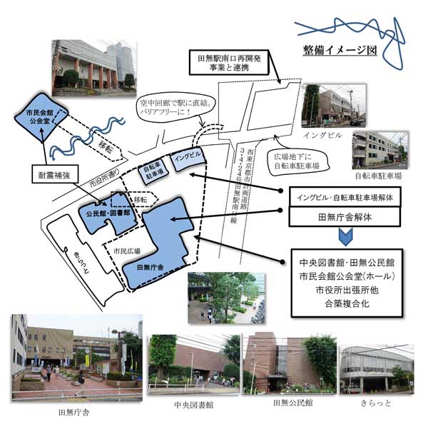 中央図書館・田無公民館・市民会館を田無庁舎の地にまとめる利点は、田無駅に近く交通の便がよく、市民が利用しやすいことを挙げている。市の計画のように市民会館の地に合築するより敷地面積ははるかに広く、中央図書館や市民会館(公会堂)も拡充可能で、市役所の出張所などを設けることもできる。動き始めた田無駅南口広場整備計画と連携して、あらたな教育・文化・芸術ゾーンの創出を、と呼び掛けている。