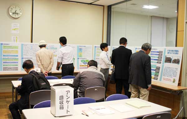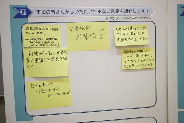 会場には統合案の検討経緯や統合の必要性、現在市が打ち出した統合方針(案)などが計11枚のパネルに示されている。ほかに市民の意見を張り出すパネルも用意した。会場を訪れる市民に対し、企画政策課の職員2人がパネルを見ながら庁舎統合の経過や内容を説明し、質問に答えていた。