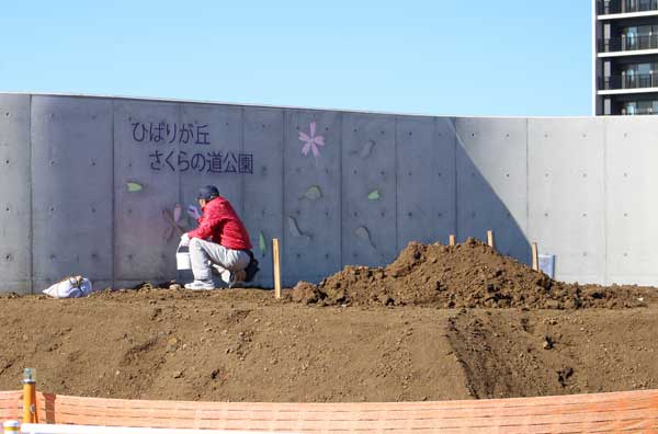 老朽化した西東京市立ひばりが丘中学校(市内住吉町一丁目)の建て替え先となる「(仮称)第10中学校」を囲む「(仮称)ひばりが丘三丁目緑道公園」の正式名称が12月5日、「ひばりが丘さくらの道公園」と明らかになった。公園に植樹する桜並木にちなんで命名された。来年3月までの開園を目指す。西東京市議会第4回定例会で丸山浩一市長が佐藤公男氏(公明党)の質問に答えた。(写真は公園工事現場)