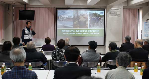 式典に先立って、市民公開講座「熊本地震に学ぶ、私たちのまちで災害が起きたら。」が院内のホールで開かれた。同病院外科の竹内俊介医師ら5人の災害派遣チーム(DMAT)が熊本地震現地に陸路で入り、医療支援を展開した報告だった。