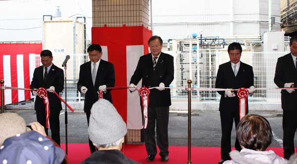西東京市内で唯一の災害拠点病院である佐々総合病院(鈴木隆文院長、田無町4丁目)に、災害時の水源を確保する地下水活用システムが完成し、[2017年]1月28日に竣工式典が行われた。この地下水は入院患者らの飲料水のほか医療用、生活用などに使用する。西東京市との間で協定を結び、地域住民にも飲料水を提供することになった。(写真は、地下水活用システム竣工式典のテープカット。背後は地下水浄化装置=佐々総合病院)