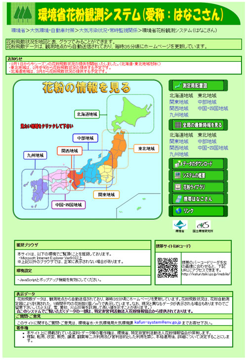 全国情報は、環境省花粉観測システム(愛称:はなこさん)で見ることが出来る。西日本や関東地方は1日から情報を掲載しているが、東北地域は2月中旬から、北海道地域は3月から提供の予定。