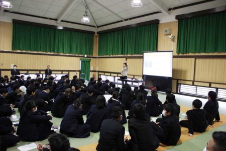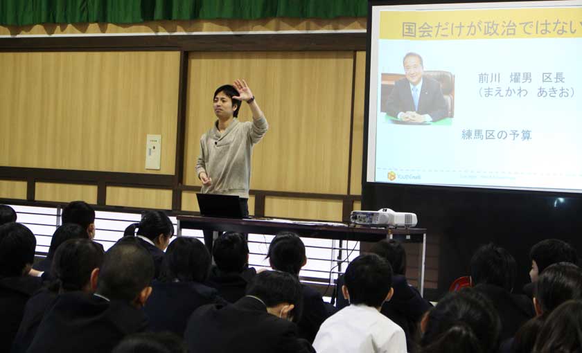 中学校の啓発講座は1月14日午前、練馬区立大泉学園中学校(桐野和之校長、大泉学園町4丁目)武道場で開かれた。2時間の特別授業に、3年生152人が集まった。講師は、NPO法人YouthCreate(ユースクリエート)代表の原田謙介さん(30)。中学高校時代はサッカー部だったと自己紹介。「ポジションは左サイドベンチ」と生徒を笑わせたあと、大きなスクリーンに「政治って何だ」と最初のテーマを映し出した。