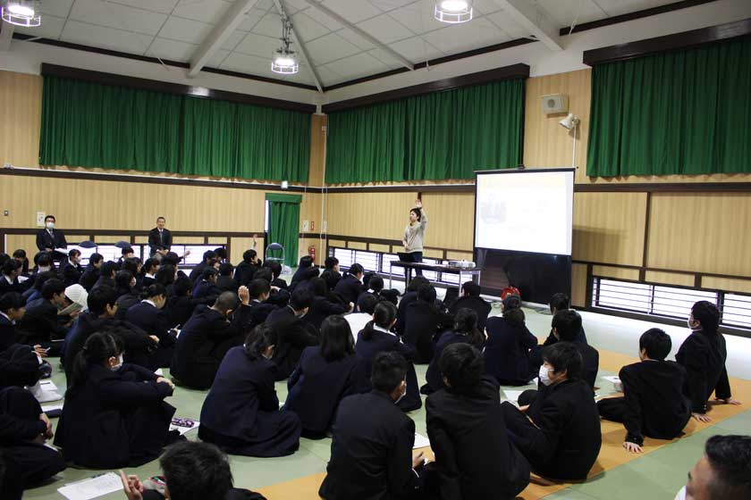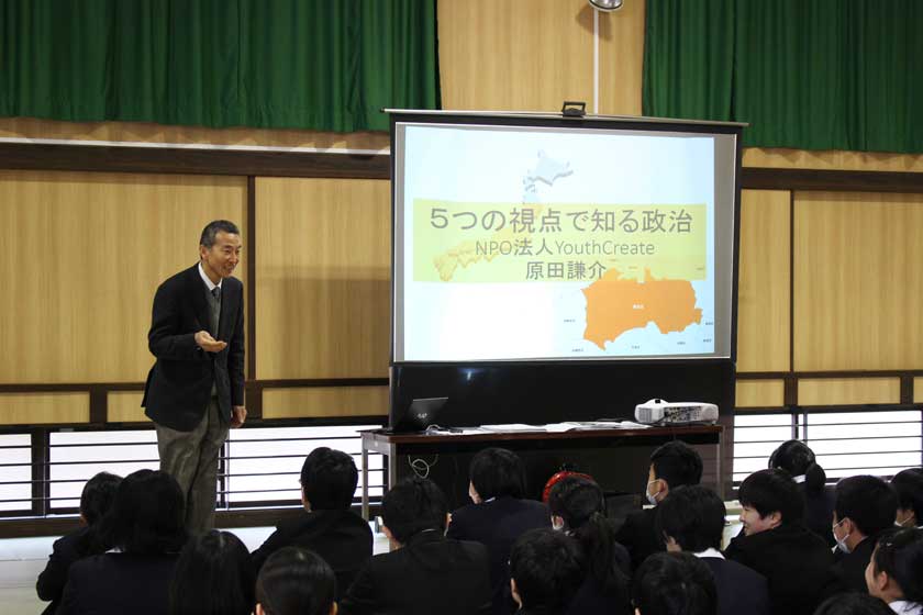 原田さんは「子ども・若者が日本や自分の住んでいる地域へ主体的に関心を持つ社会を目指し」て、出前授業や講演に駆け回る日々。生徒たちに問いかけ、いろいろな意見や答を受け止める。やりとりは具体的。ユーモアを交え、笑いを引き出しながら、政治を身近な風景に引き寄せた。