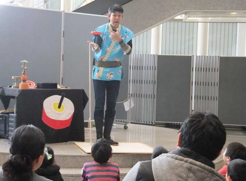 パフォーマンス後には、昔遊び体験も。こま、べーごま、けん玉、お手玉、めんこ、羽根つき、南京玉すだれなどの昔遊びに、皿回し、ディアボロ、デビルスティックなど大道芸でみるアイテムもあり、多くの親子がチャレンジ。始めは「できない…」と尻込みしていた子どもも、付添いのはずの大人も、いつしか夢中でトライ。たけちゃんが一人一人に丁寧に教えてくれる。できた時の嬉しさ!感激!