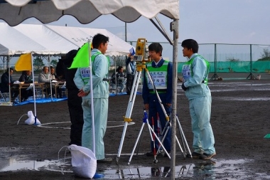 同コンテストは、全国の工業系の高校生が出場する「ものづくり甲子園」と呼ばれる。測量部門は、1チーム3人で、制限時間内に校庭に描いた総延長150mの5角形の距離や角度を測り、データ計算を行い、正確さと時間の速さなどを競う。