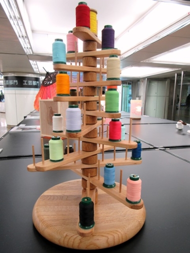 工芸部門に応募した難波さんの作品は「母への贈り物」。応募したクリスマスシーズンに合わせ、ツリーをイメージした作品。「洋裁が趣味の母へ、ミシン糸を整理するのに役立つものを作りたかった」と難波さん。学校にあった廃材で約1年かけて作成。土台は壊れた椅子の座面を使ったという。