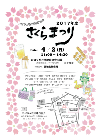 西東京市と東久留米市にまたがるひばりが丘団地で[2017年]4月2日、同団地自治会主催のさくらまつりが開かれた。好天に恵まれた日曜日。出店でジュースを求めたり桜の下に座って持参のごちそうを食べたり。新たに越してきた若い家族連れなどが団地広場で思い思いに春の休日を楽しんでいた。(写真は、日曜日の昼下がり。桜花とともに団欒のひととき=ひばりが丘団地)