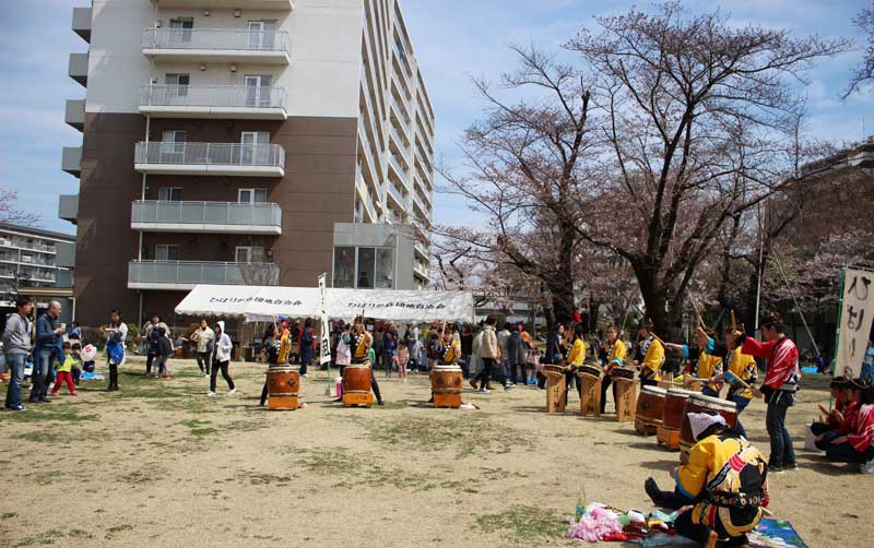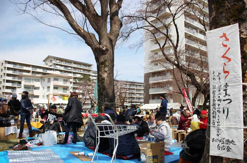 広場の一角に桜の古木が並ぶ。花はほぼ満開。たわわな枝の下に、シートに座っておにぎりやサンドイッチをほおばる住民らの姿があちこちに見える。和太鼓が響き、駆け回る子どもたちの声が聞こえる。