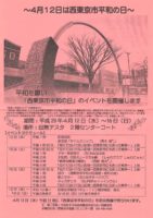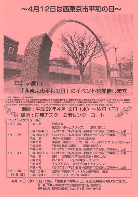 この日の午後、田無駅北口のアスタビル2階のセンターコートで「平和の日」記念式典が行われた。2001年1月に西東京市が合併で誕生した際、田無駅一帯が爆撃され多数の犠牲者が出た4月12日を条例で「西東京市平和の日」と定め、「世界の恒久平和を願う市民の精神に基づき、平和施策を市民の協力と参加のもとに推進する」と決めた。