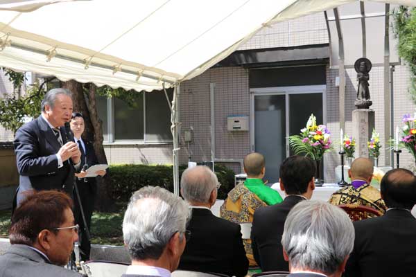 小林新会長は、前会長からバトンを渡された経緯に触れ、「72年前の爆撃で130人を超える犠牲者が出て、ここ総持寺に約90人ものご遺体が安置されたと聞いています。駅から少し離れた所沢街道沿いも間もなく爆撃され、母方の祖父母を喪いました。そんなこともあり、昨年亡くなられた(前会長の)浜野(重男)先生から『やってくれ』と言われ(会長職を)受けることになりました。時間が経つと記憶が薄れていきますが、決して忘れてはならない平和に対する思いを、これからも引き継いでいきたいと思います」と述べた。