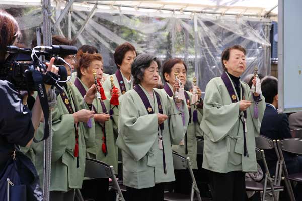 前日までの雨が上がり、花冷えから一転、汗ばむほどの好天に恵まれた。参道を挟んで向かいは、古木のしだれ桜が満開。テント内には関係者ら約80人(主催者)が集まった。