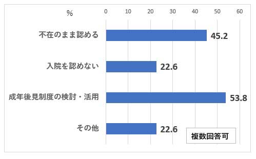 図は、2013年と少し古い調査だが、公益社団法人成年後見センター・リーガルサポート「病院・施設等における身元保証等に関する実態調査報告書」より病院についてのみ筆者が作成したものである。96%の病院が身元保証人等を求めている。病院の半数は、「不在のまま入院を認めている」が、入院させないと答えた病院が23%もある。