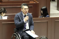 平昌パラリンピックのアイスホッケー日本代表選手として活躍した西東京市職員、高橋和廣さんが西東京市議会[2018年]第1回定例会最終日の3月28日、開会に先立って挨拶し、市民の応援に感謝した。(写真は、感謝の言葉を述べる高橋選手=本会議場)