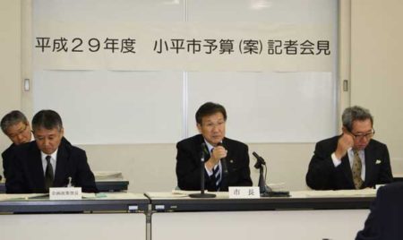 小平市の2017年度一般会計予算案は総額608億9700万円、前年比1.8%減となり、国民健康保険事業など4特別会計を合わせた当初予算総額は1024億5800万円、前年度比0.6%減となった。4月9日の市長選で決まる市長が政策実現のため補正予算を組むとの前提で、新規事業などを控える骨格予算として編成した。2月10日に開いた記者会見で、小林正則市長らが明らかにした。(写真は、小平市の予算案を説明する小林正則市長=中央)