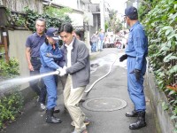西東京市田無町4丁目の町内会「旭会」で10月18日(日)、住民が消火栓に直接接続して放水できる消火資機材「スタンドパイプ」を使った防災訓練が行われた。西東京消防署の指導の下、住民約50人が近所の私道で機材の使い方などを学んだ。