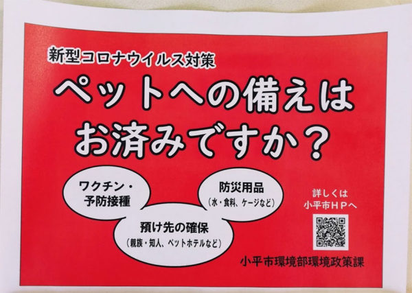 新型コロナウイルスの感染が拡大するなか、心配されるのがペットへの対応だ。飼い主が感染した場合、本人だけではなく家族全員が濃厚接触者として隔離される可能性がある。そうした事態に備えてペットの預かり先を見つけておくよう呼びかけるポスターを小平市が作成し、4月14日から市内でペットフードを販売する店舗などに掲示を始めた。